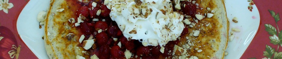 You may spread with butter, honey, jam or syrup, but The Joyful Hermit topped pancake with some home-made brandied cranberries* that saved, refrigerated, for an embarrassingly long two years!